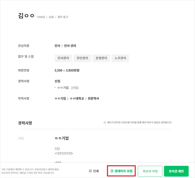 ▼ 인재 프로필 확인 시, 업데이트 요청 버튼 클릭하여 인재에게 이력서 업데이트 요청 가능