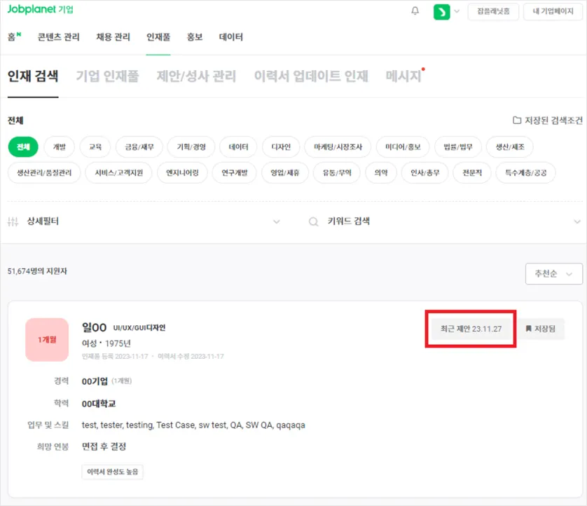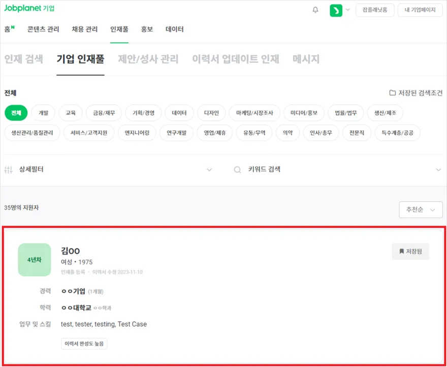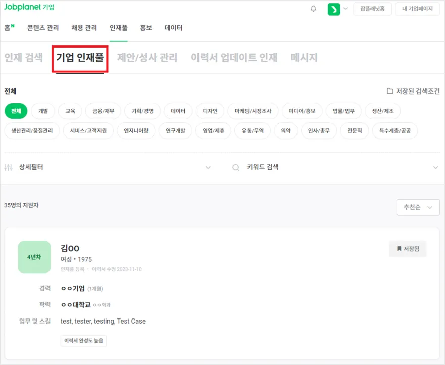 위 예시 화면처럼 우리 기업에 인재풀을 등록한 인재들을 ‘기업 인재풀’ 탭에서 따로 볼 수 있습니다.