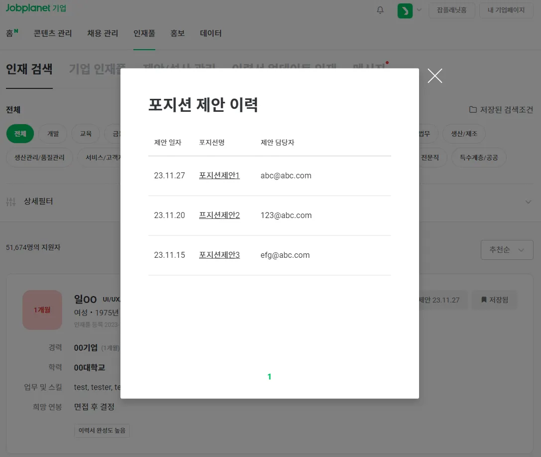 ▼ 최근 제안 버튼 클릭 시, 기업 내 다른 담당자가 어떤 포지션을 제안했었는지 확인 가능