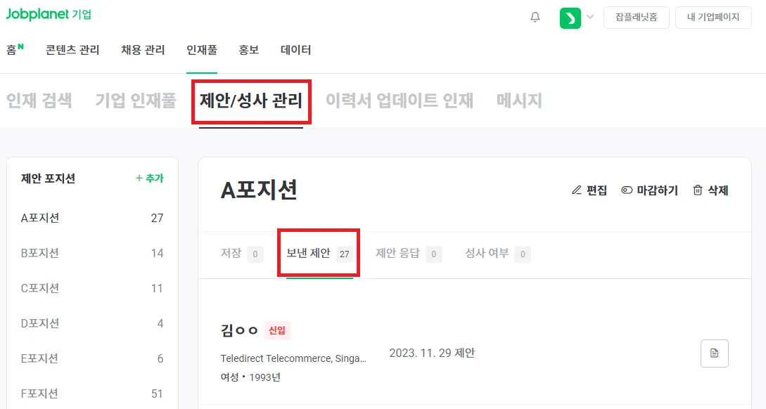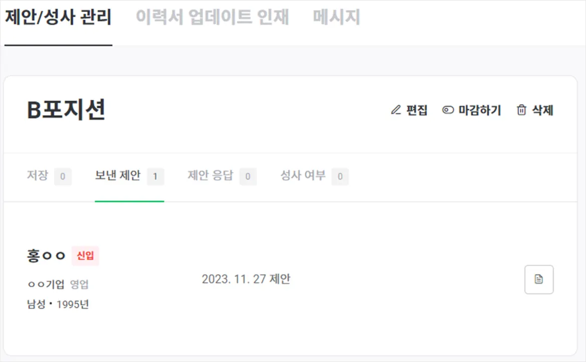 제안을 한 인재들은 포지션별로 ‘제안/성사 관리 > 보낸 제안‘ 탭에서 상태 확인이 가능합니다.