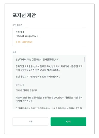 인재는 카카오 알림톡, 앱 등을 통해 포지션 제안 내역을 확인하고 수락 여부를 선택할 수 있습니다.