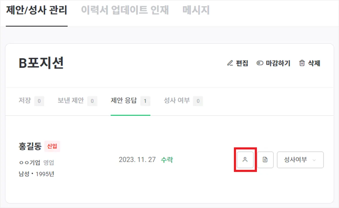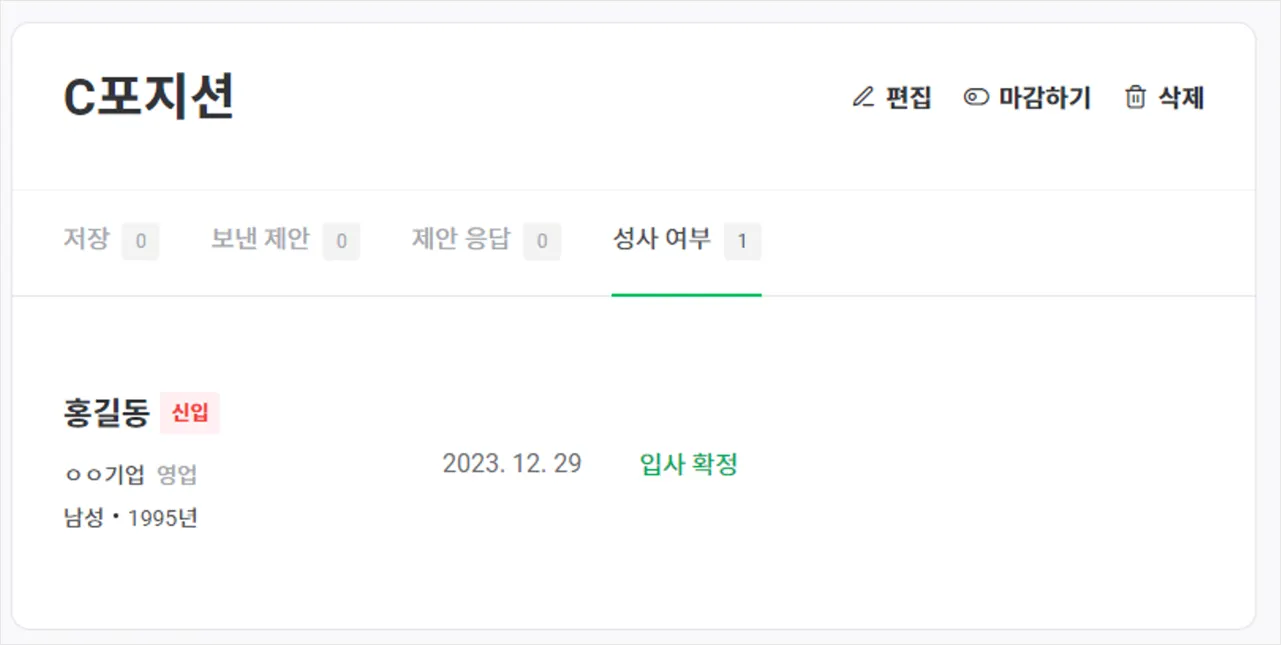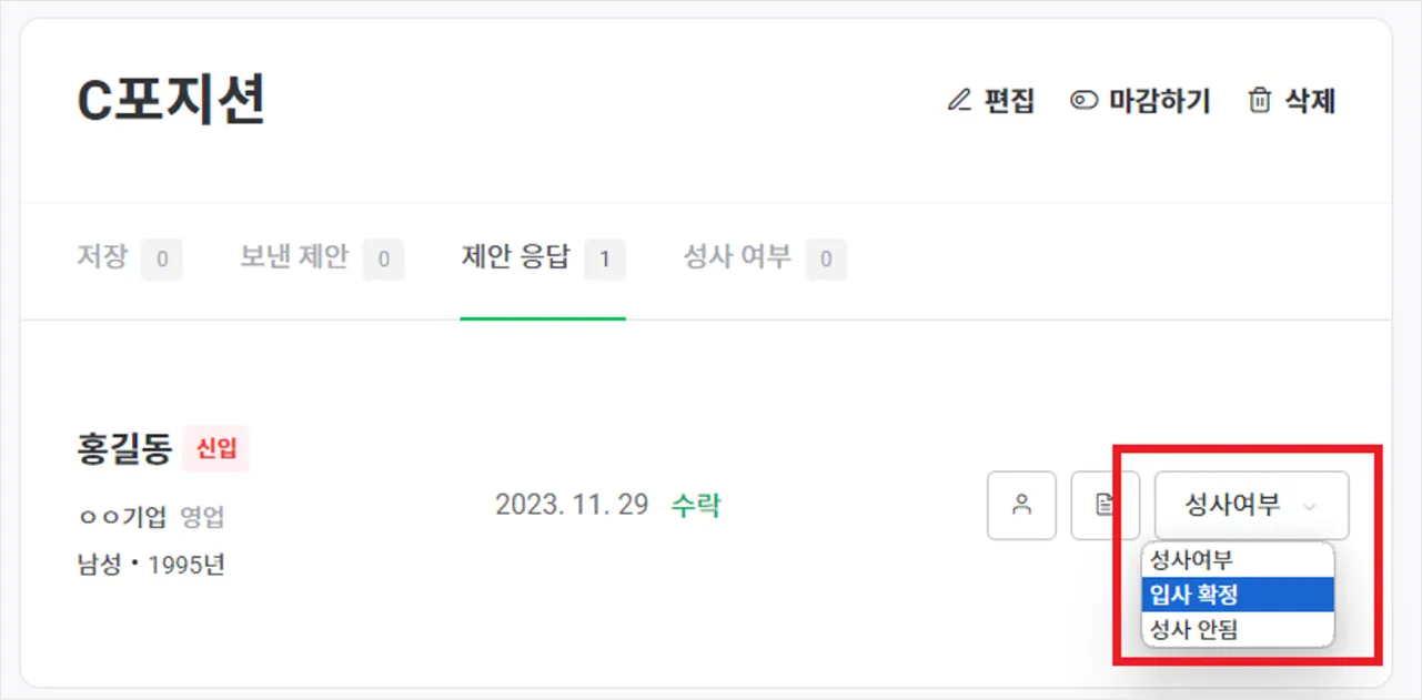 입사 확정 or 성사 안됨 값을 선택하여 인재를 관리할 수 있습니다.