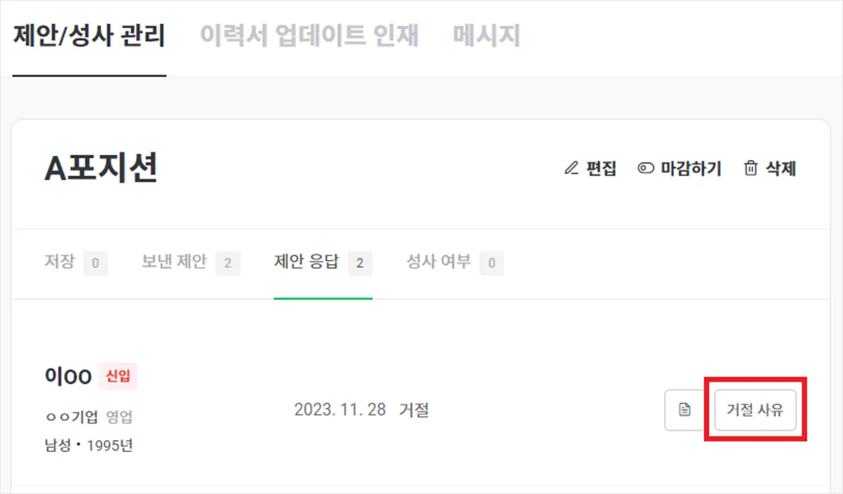 인재가 포지션 제안을 거절하면 거절 사유를 확인할 수 있습니다. (단, 거절한 인재의 연락처는 확인할 수 없습니다.)