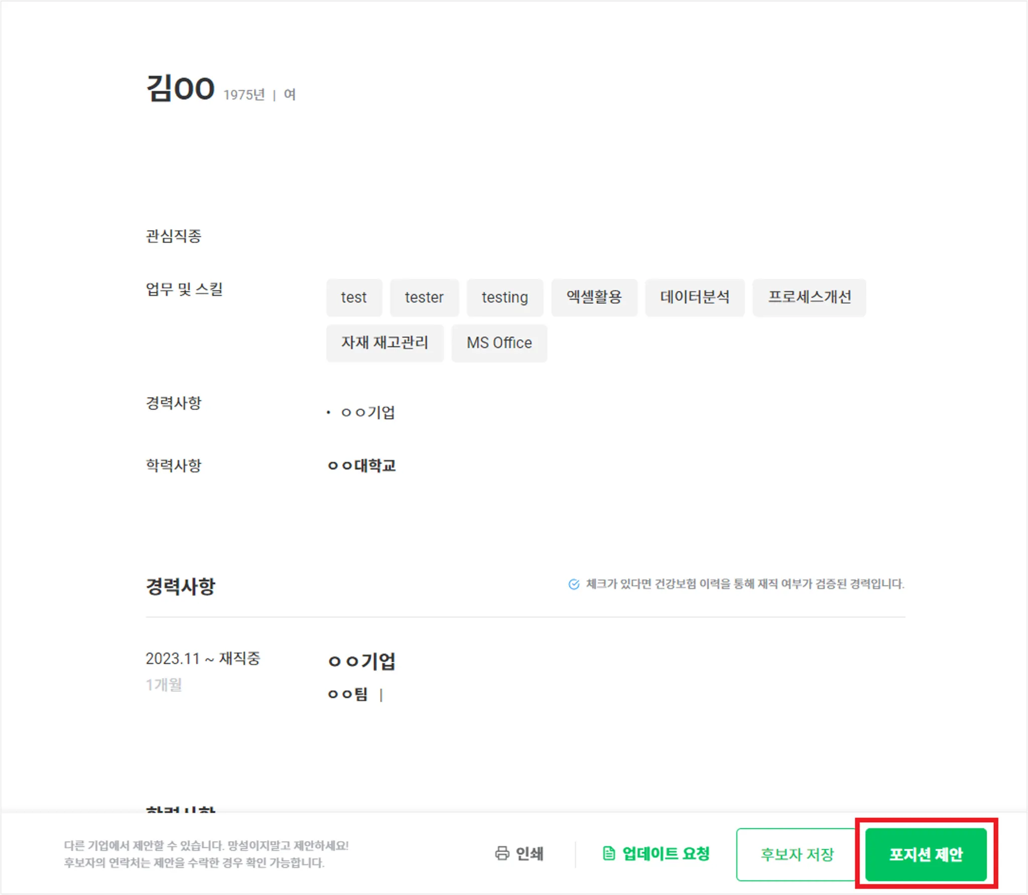 인재에게 ‘포지션 제안’ 버튼을 클릭하여, 간편하게 제안할 수 있습니다.