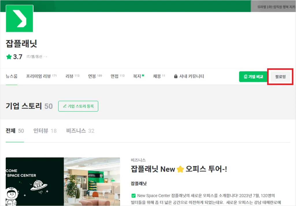 ▼ 기업 페이지 우측 팔로잉 버튼 클릭