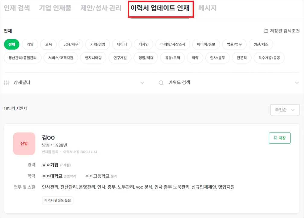 인재가 이력서를 업데이트하면 ‘이력서 업데이트 인재’탭에서 모아 볼 수 있습니다.