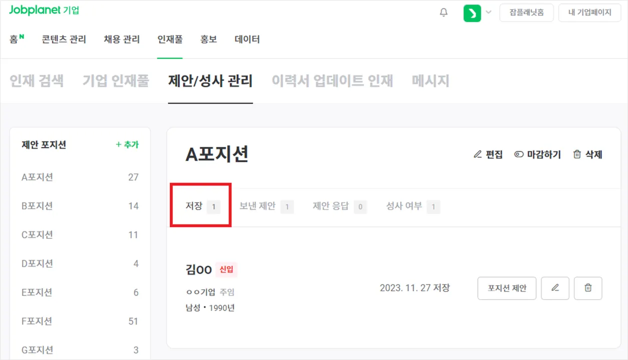 포지션 별로 저장한 인재들은 ‘제안/성사 관리’ 탭 에서 따로 볼 수 있습니다.