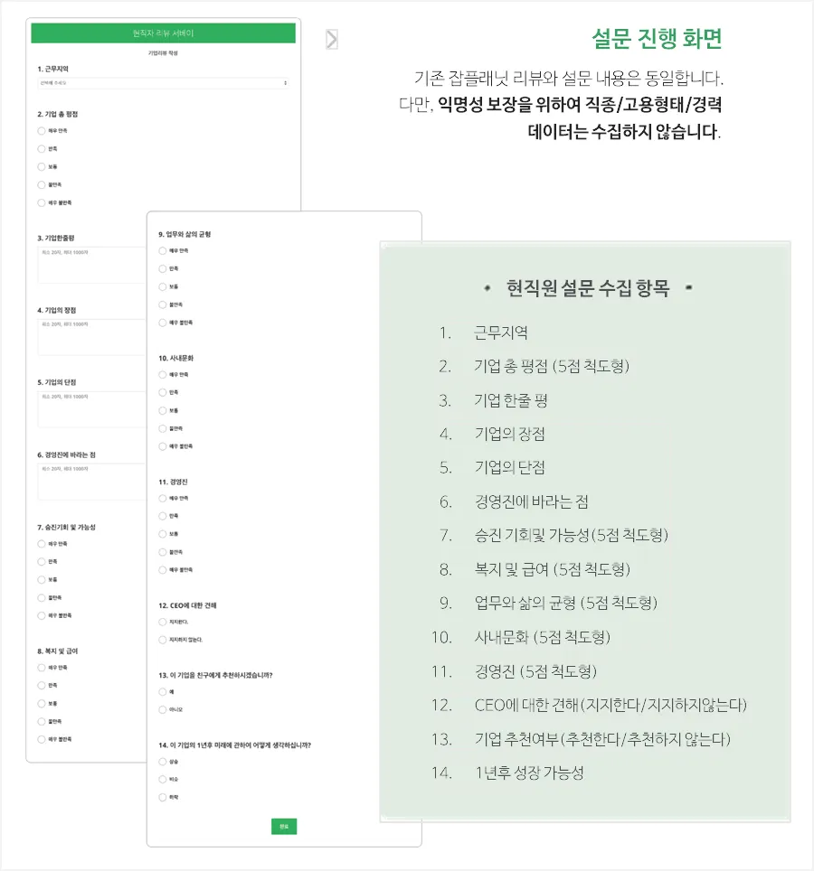 - 현직원 설문 현직원들의 리뷰를 수집하여 기업 페이지에 노출할 수 있는 기능입니다.