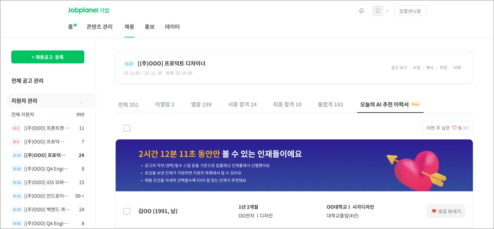 아래와 같이 호감을 받은 인재가 지원할 경우 별도로 구분표가 붙어 보여집니다!