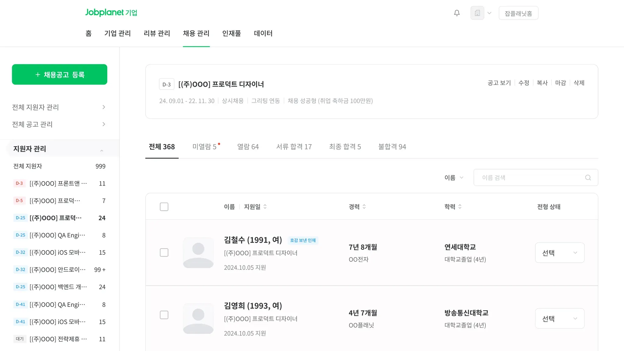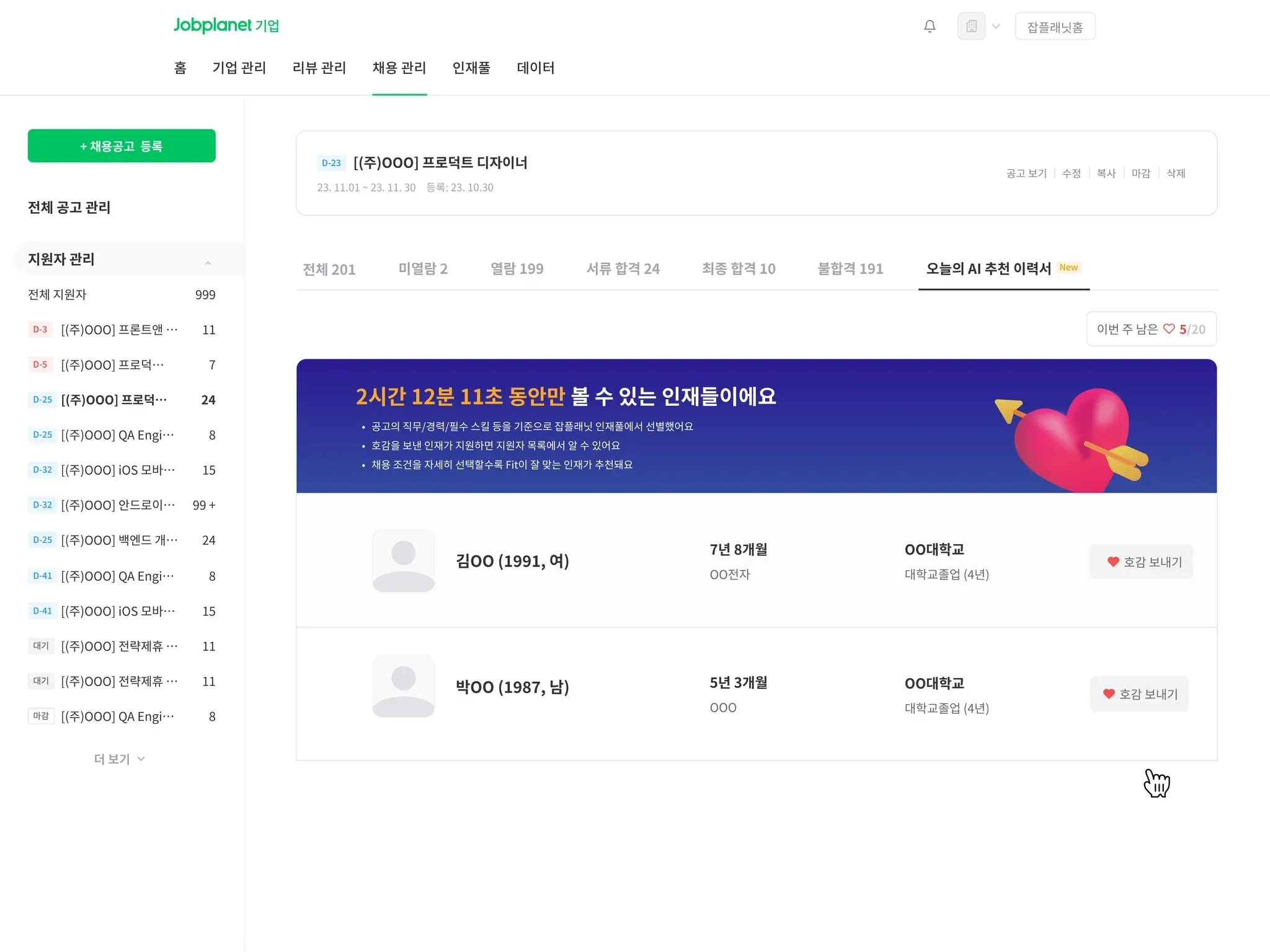 공고 등록시 입력한 정보 기반으로 잡플래닛 인재풀에 등록된 이력서 중 공고와 직무나 경력이 유사한 이력서가 보여집니다.