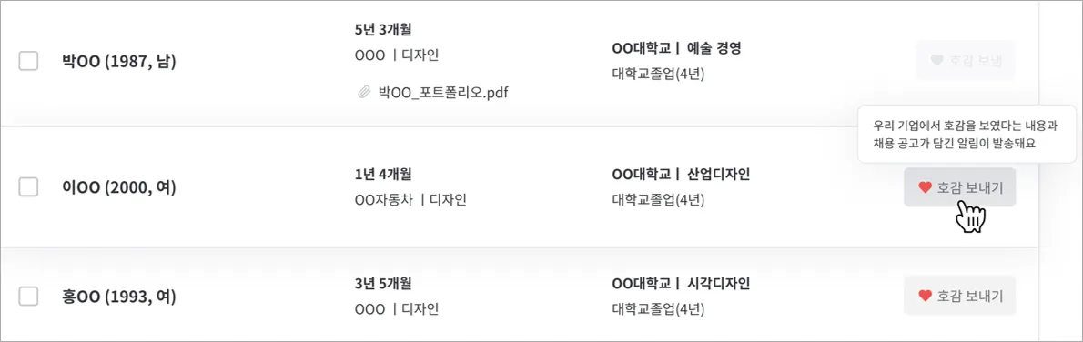 아래와 같이 호감을 받은 인재가 지원할 경우 별도로 구분표가 붙어 보여집니다!